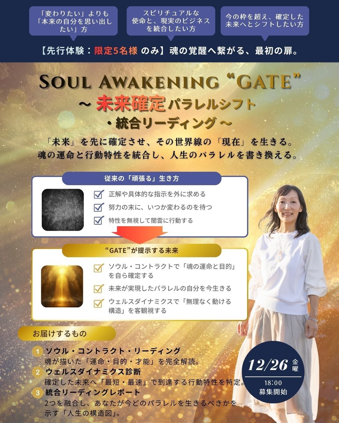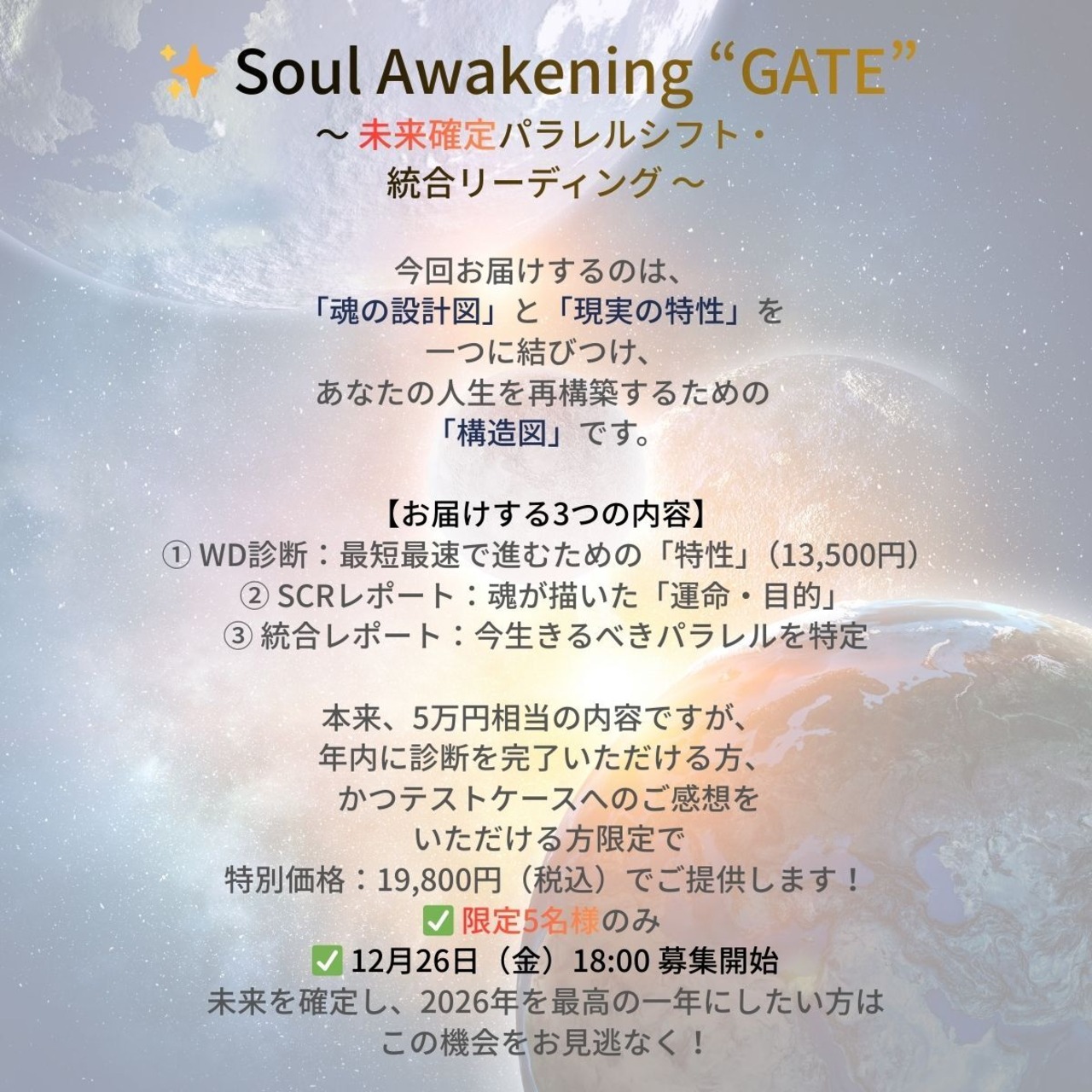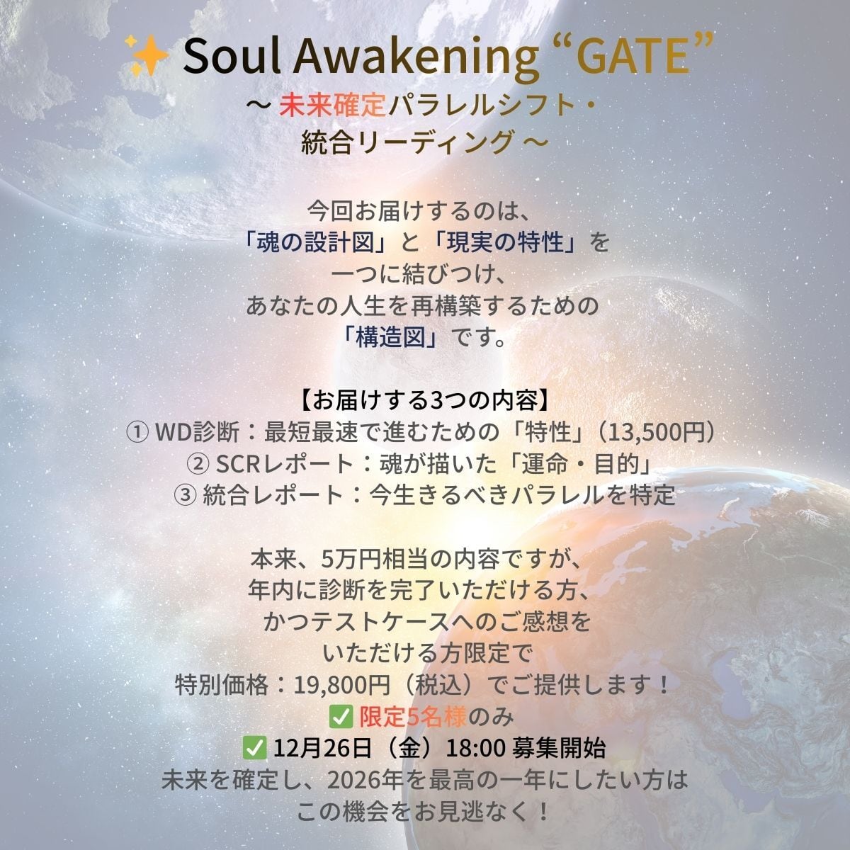 【限定5名】Soul Awakening “GATE” 〜未来確定パラレルシフト・統合リーディング〜