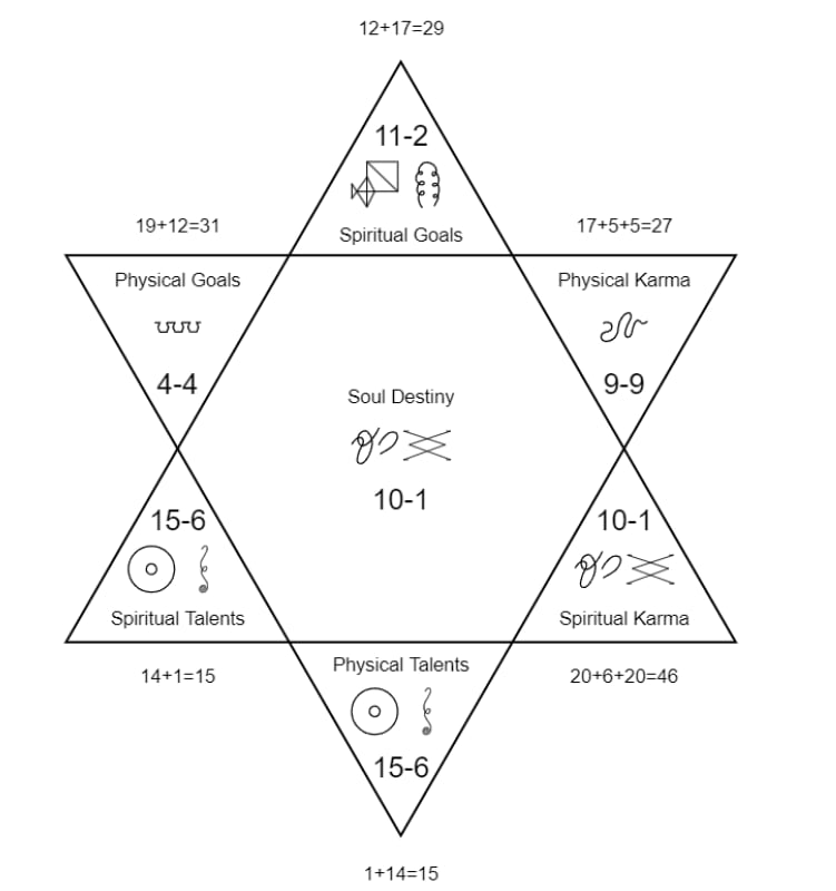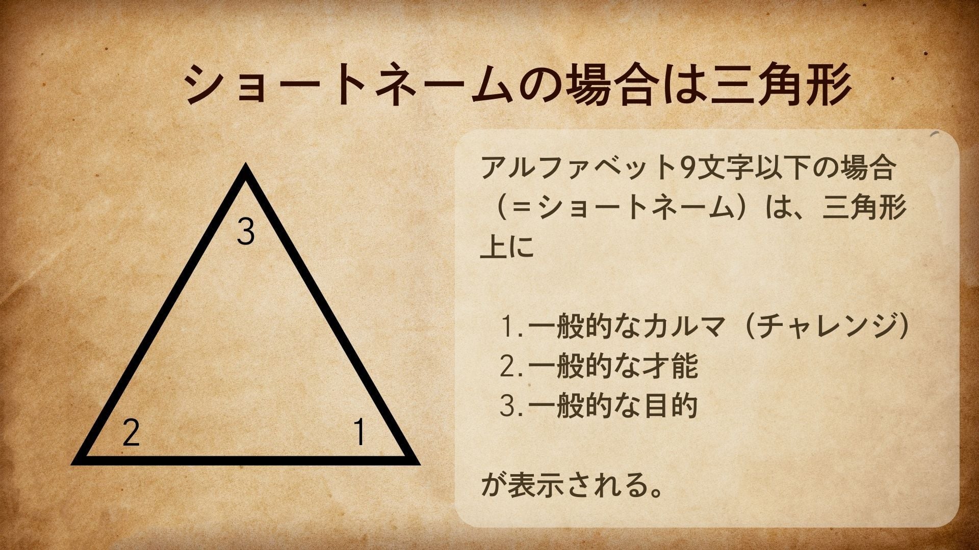 ※アルファベットのお名前表記が9文字以下(ショートネーム)の場合は、一般的なカルマ・才能・目的となります。